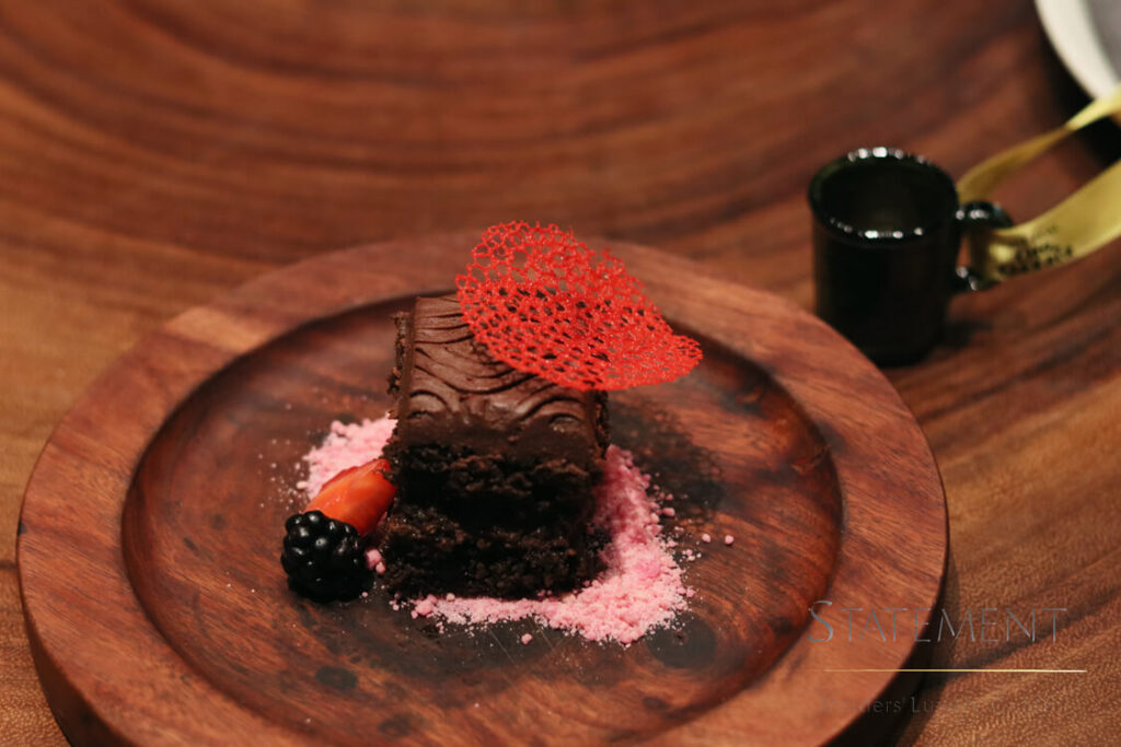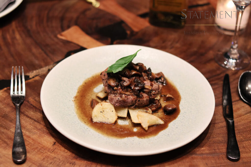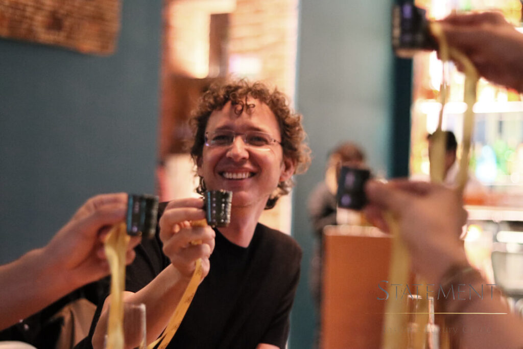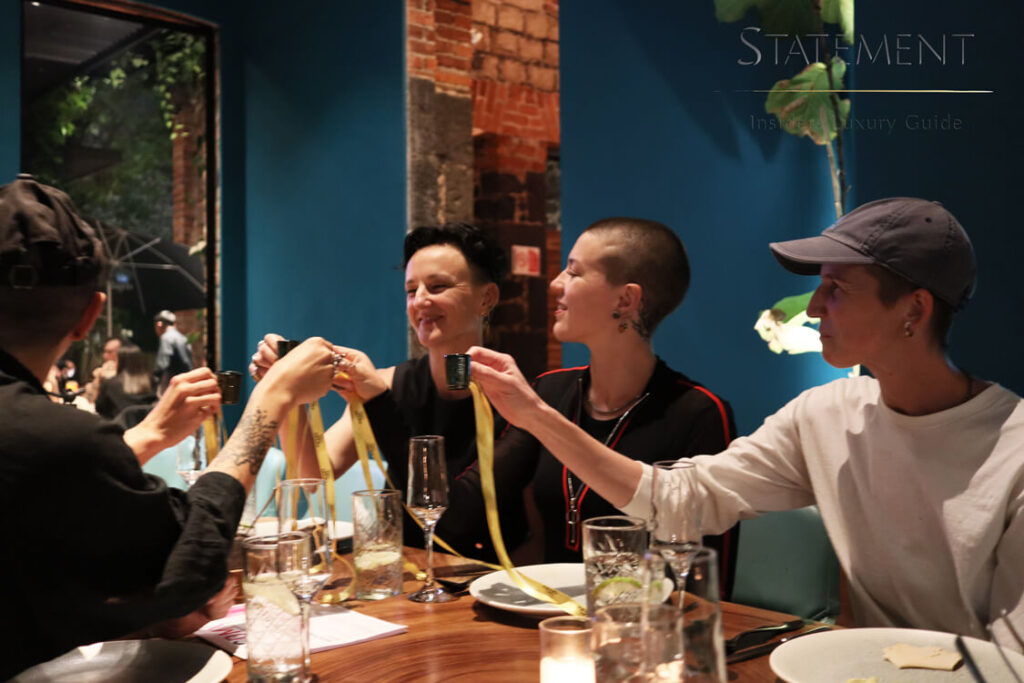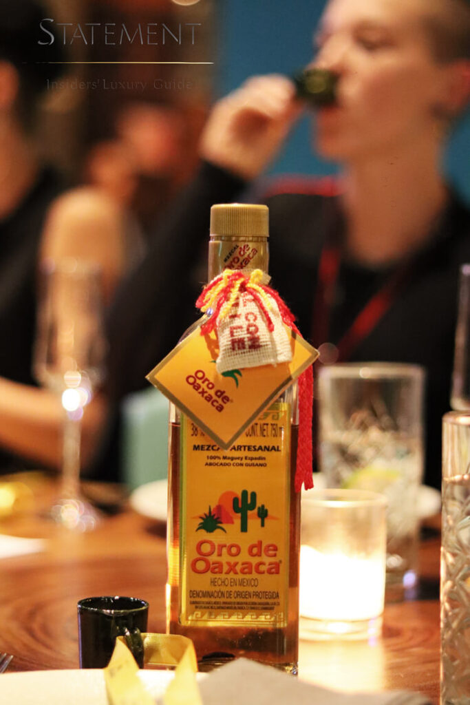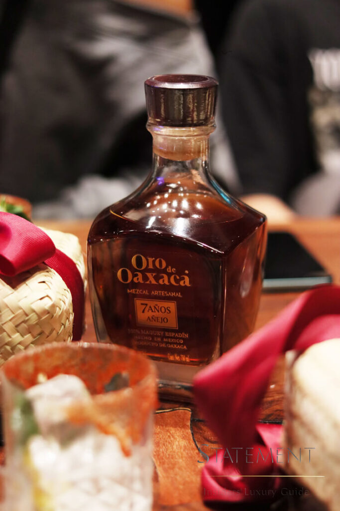 La cena comenzó con una entrada que consistió en unos tacos gobernador, maridada con mezcal Oro de Oaxaca, seguida de un delicioso filete con champiñones, exquisitamente maridado con el sabor acaramelado del mezcal Oro de Oaxaca, para cerrar con broche de oro con un maravilloso pastel de chocolate que siguiendo con el maridaje cautivó en paladar de los comensales.