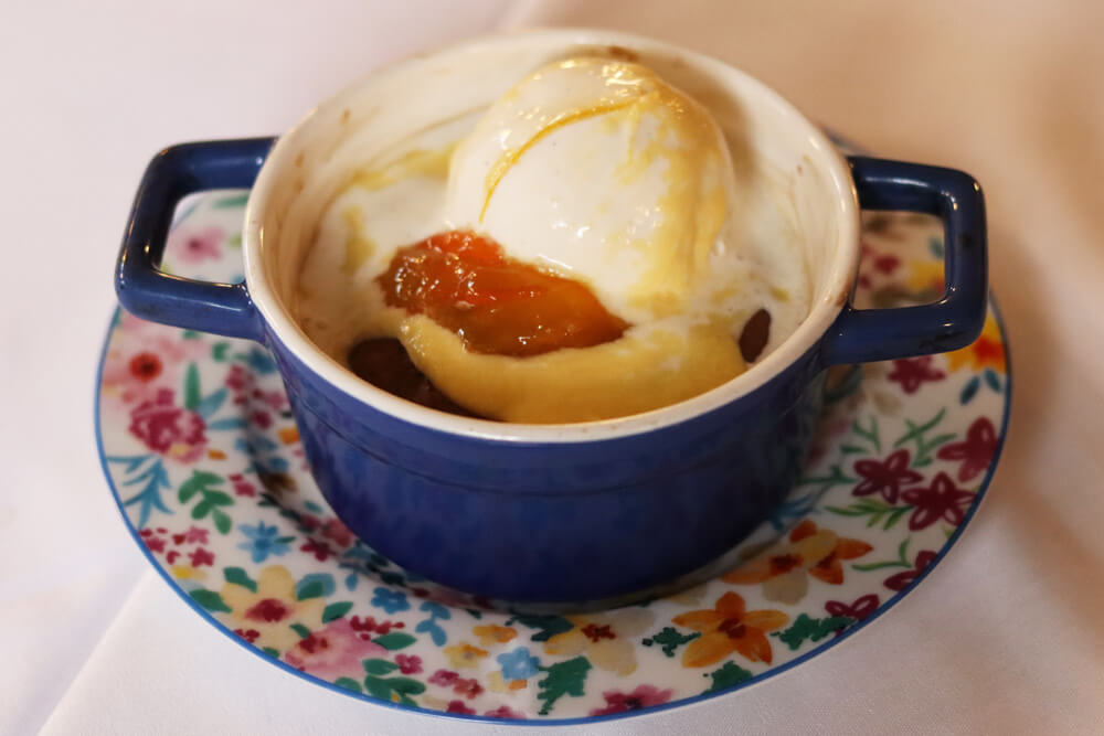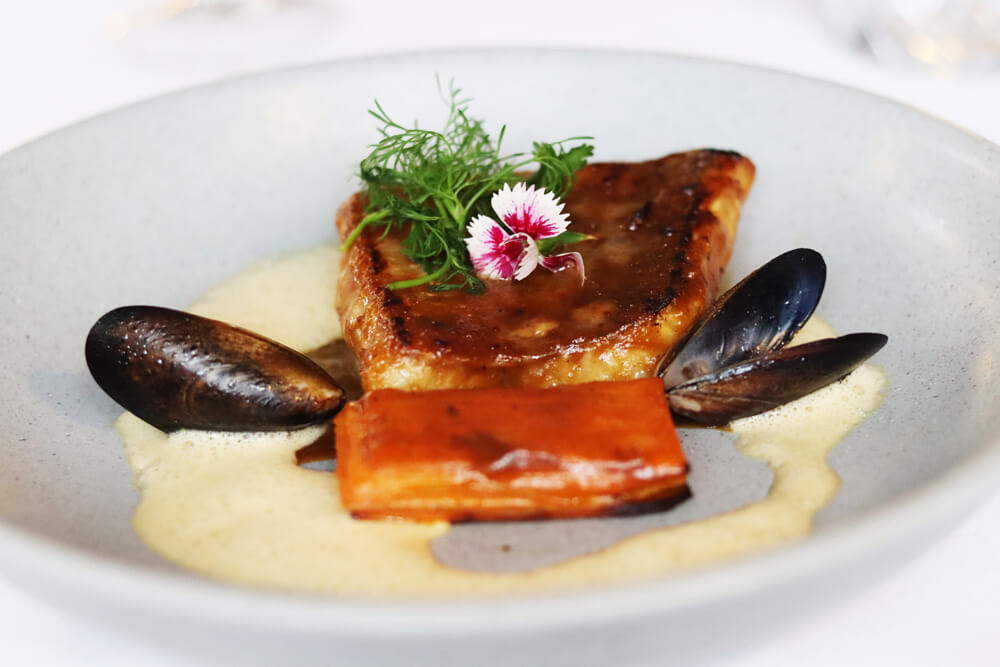 The next choice is sea bass with miso caramel, served with mussel emulsion and sweet potato fondant. A dish that will conquer diners and is bound to become a new favorite in the house and that demonstrates the mastery of French cooking techniques of the Les Divins kitchen.