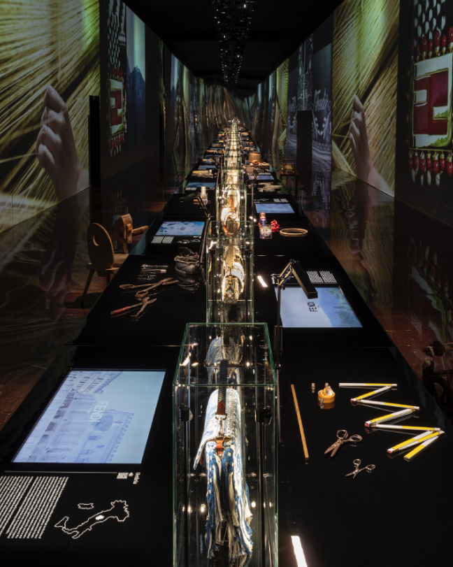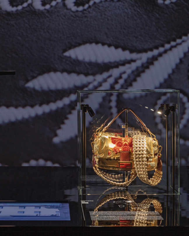 On the ground floor of the Palazzo della Civiltà Italiana, FENDI presents the first selection of twenty pieces of Baguette’s hand-in-hand creations, each one created in a different province of the country, in collaboration with its best local artisans.