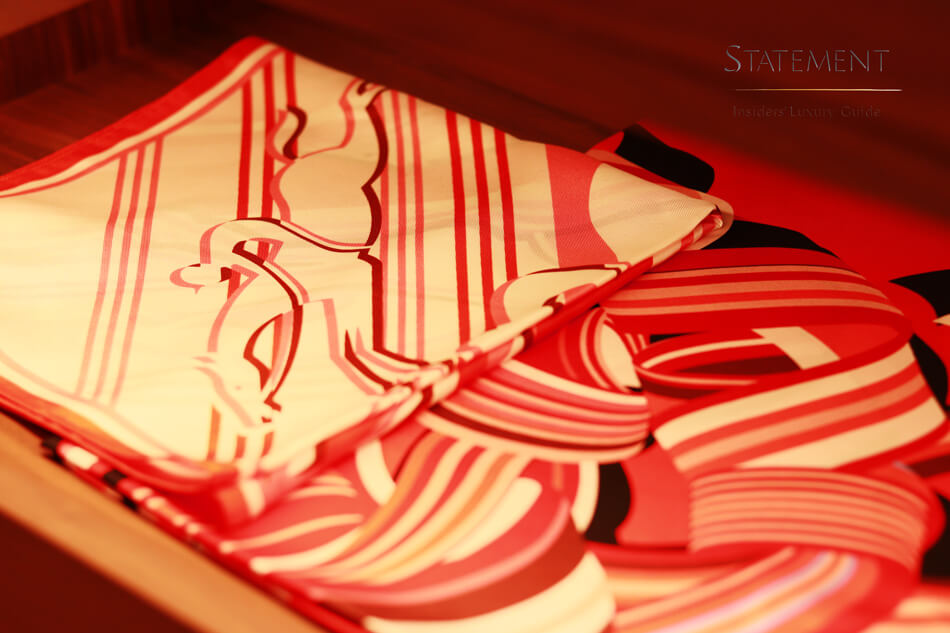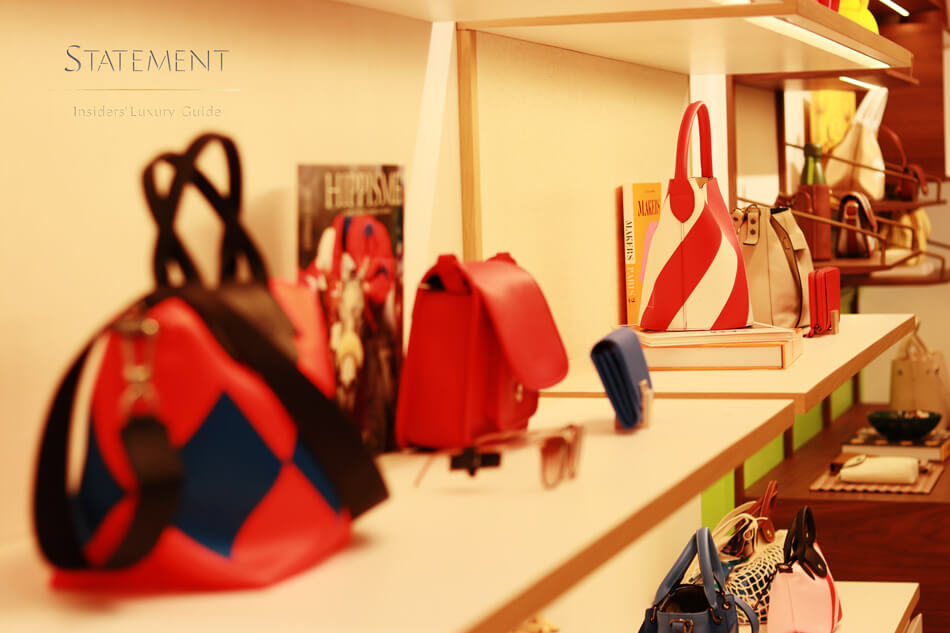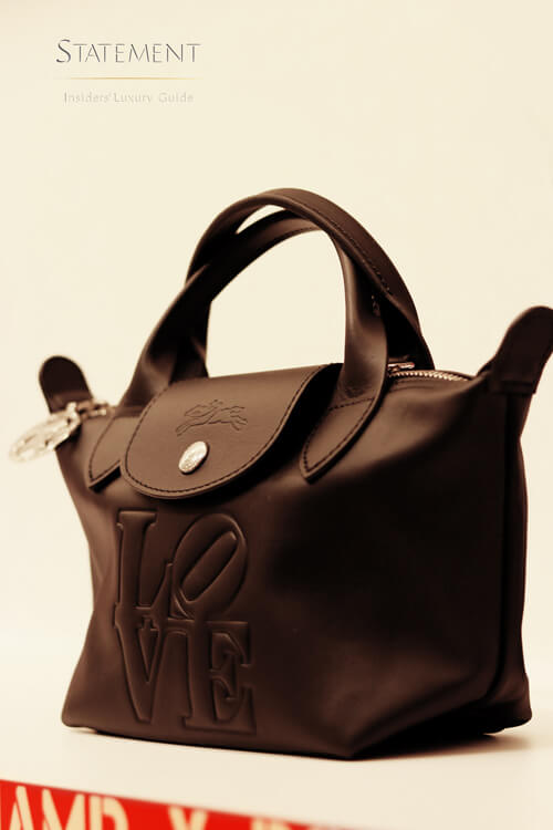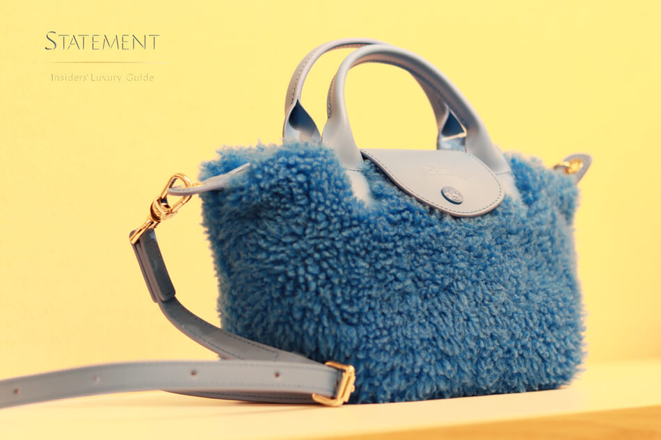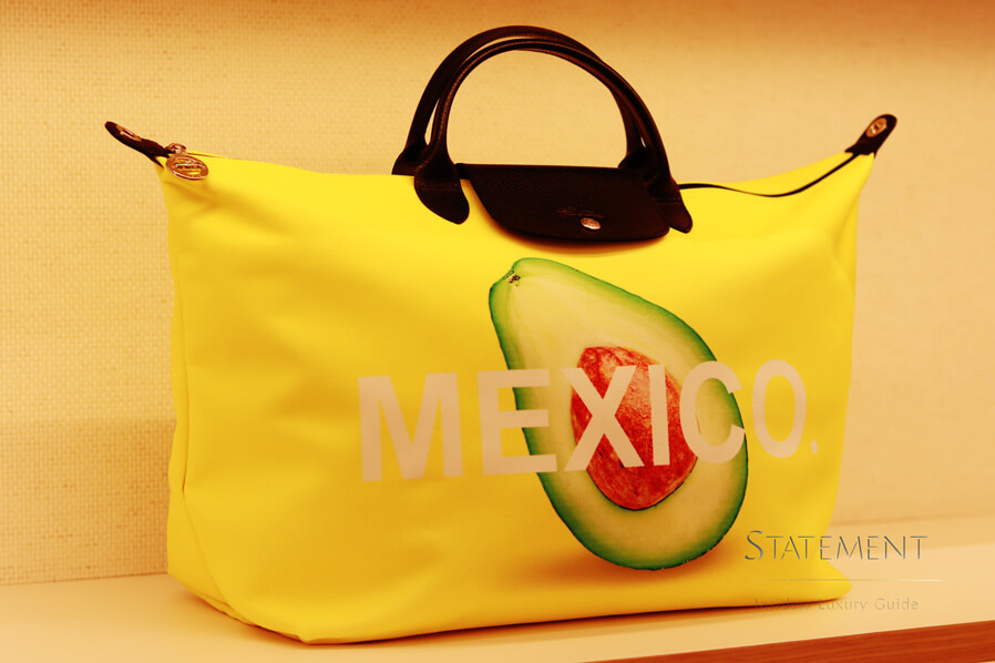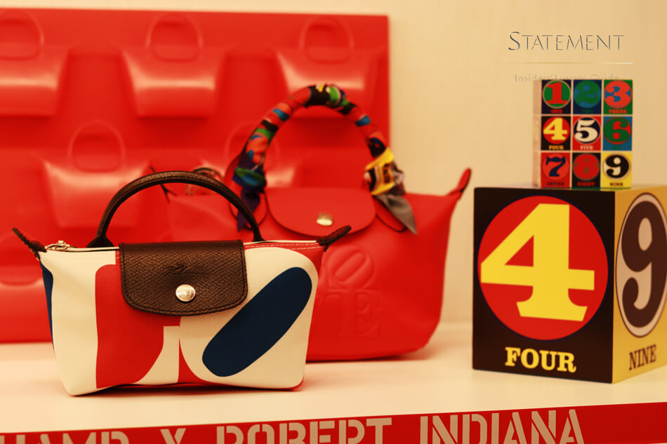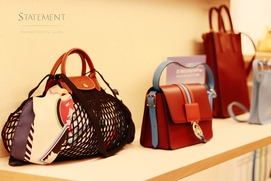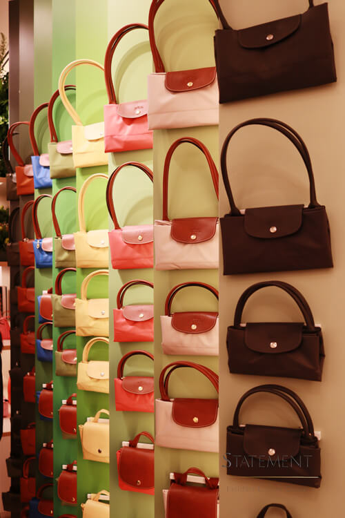 Por su carácter icónico, Le Pliage® cuenta con su propio espacio un muro que emula un librero con líneas verticales en distintos colores, tras las cuales se encuentran una serie de nichos para almacenar los bolsos según su color, tamaño y formato.
