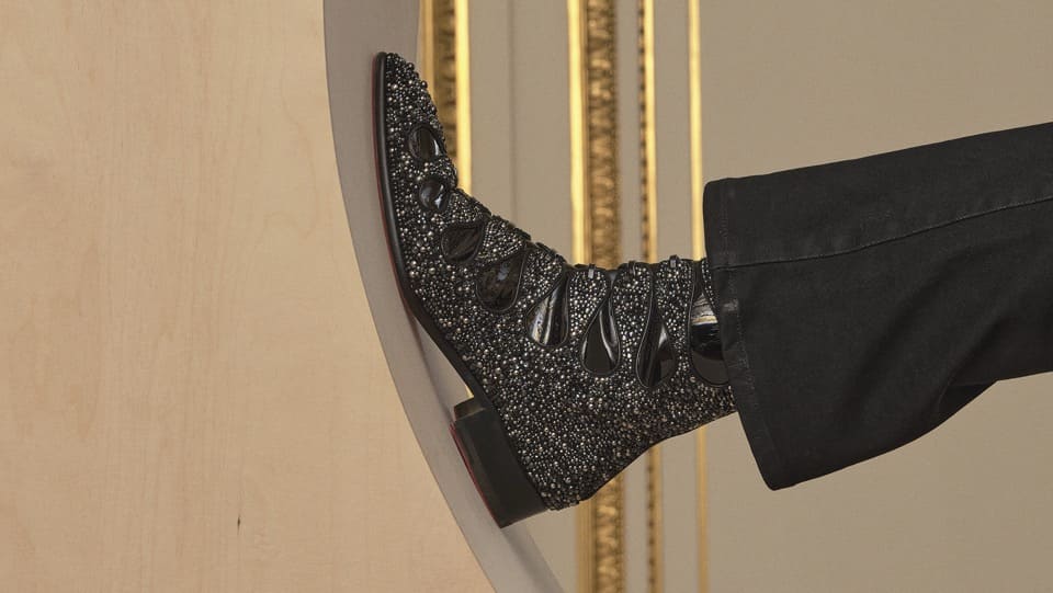 Al pasar al Salon des Aigles, la presentación continúa con cuatro performers que encarnan estilos clave de la colección, en una interpretación dinámica de «24 horas en la vida de un dandy». Diseñado para apreciarse desde distintos ángulos, el escenario está enmarcado por dos vitrinas artísticas llamadas Vitrines l’Éclaté, que deconstruyen visualmente la artesanía detrás de los modelos Farfaman y Farfarock. Los performers lucen una cuidada selección de piezas destacadas: las botas Lord Chamb de inspiración ecuestre y alta costura; el mocasín O Louvre, que presenta una lujosa banda de tela moiré grosgrain; y el Circus Booty Perla, una reinterpretación opulenta de un diseño de archivo, ahora decorado con cristales y detalles cortados con láser. Este modelo combina distintos cueros, incluido gamuza adorna da con 10,000 cristales y perlas que evocan con humor el cuello plisado de un arlequín. Completa el conjunto el Farfaman, una expresión refinada de la técnica de bordado mostrada en el salón anterior y también presente en las vitrinas.