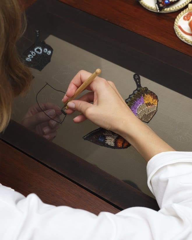 La patine y le glaçage son dos métodos con los que se logra el distintivo acabado tridimensional y brillante de la línea de zapatos Chambeliss. La tercera técnica destaca el detallado bordado artesanal elaborado por el legendario taller parisino Maison Lesage, que aparece en los modelos de edición limitada Farfajour y Farfanuit.