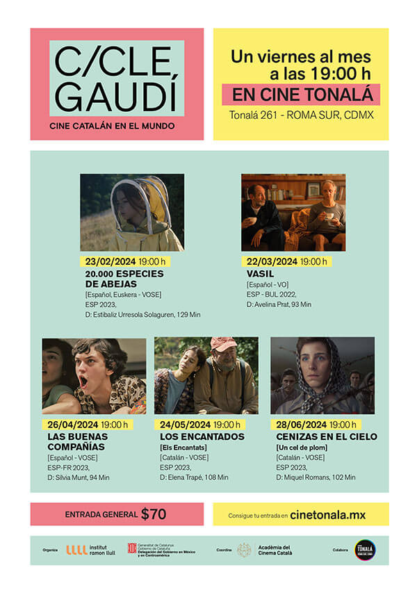 La cartelera presenta una muestra de cine contemporáneo que presentará cada mes un largometraje de factura catalana nunca antes visto en México. En este primer semestre del Ciclo Gaudí 2024 se proyectarán cinco películas catalanas producidas entre 2022 y 2023. De febrero a junio, cada último viernes de mes a las 19 hrs, en el Cine Tonalá de Roma Sur.