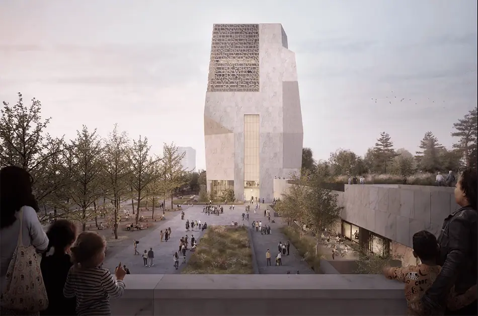 Su elemento más emblemático es la torre del museo, revestida en piedra, cuya fachada incorpora una pantalla de ventanas que deletrea una cita de Barack Obama en braille, convirtiendo al edificio en un símbolo de inclusión, memoria y comunidad.