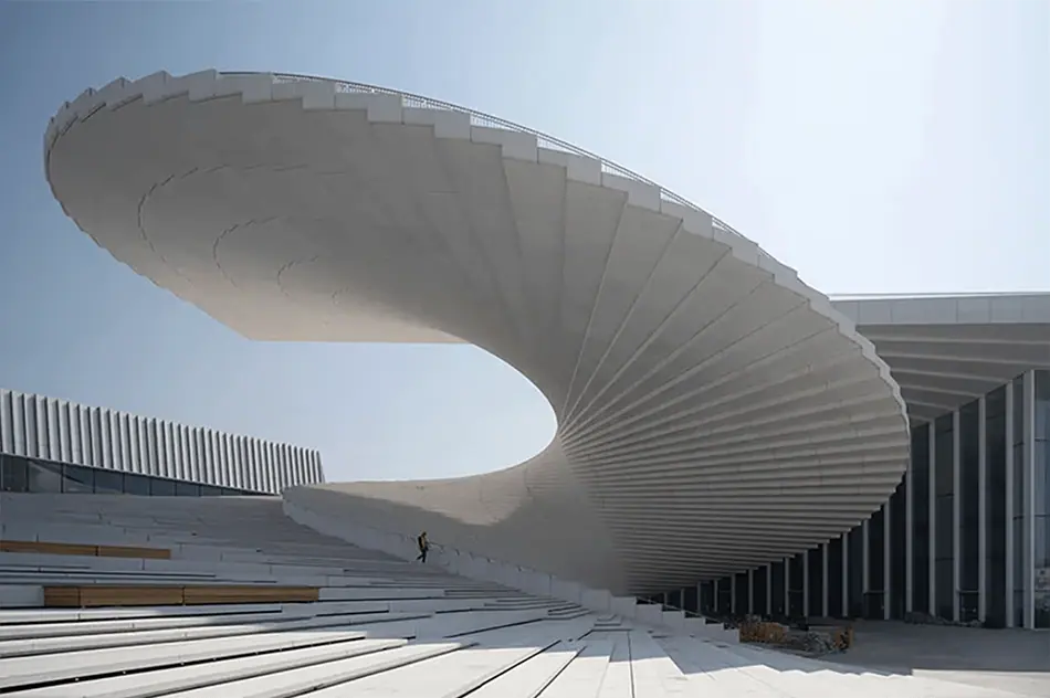 La nueva Ópera de Shanghái, diseñada por Snøhetta, redefine el concepto de espacio cultural público. Su distintivo techo en forma de abanico funciona también como una gran escalera transitable, permitiendo a los visitantes ascender desde la planta baja hasta una plaza pública en la azotea.