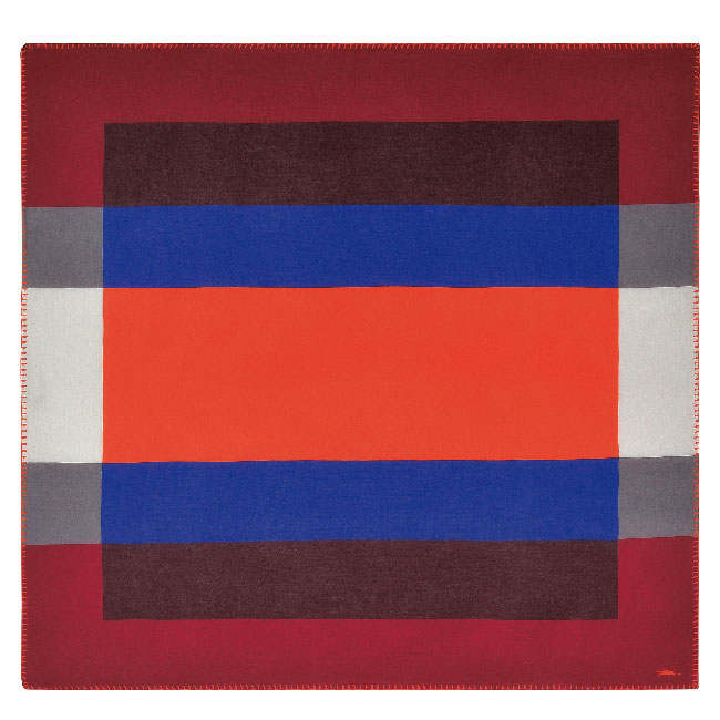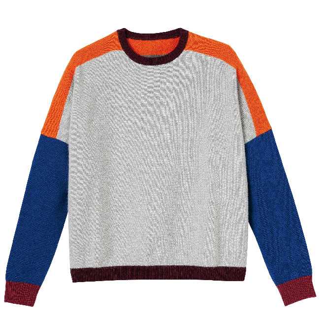 The blanket is accompanied by a wool shawl and a long fringed scarf, both embroidered with the Longchamp racehorse logo. Completing the capsule is an oversized color-blocked sweater in a luxurious wool and angora blend, perfect for a stylish weekend in the Alps or elsewhere!