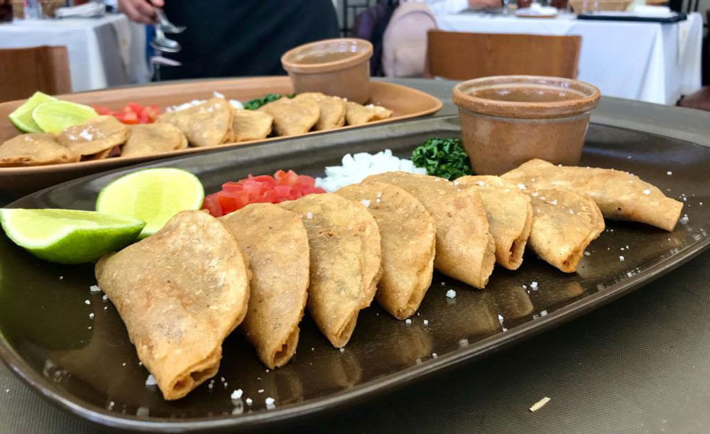Abre tu apetito con una refrescante michelada sazonada con tres chiles. Su picante sabor es el toque perfecto para preparar tu paladar para disfrutar de este menú. Comienza con una órden de tacos de “Atropellado”. El sello de todas las cantinas del noreste. Un rico taquito dorado relleno de deshebrada de carne seca de Nuevo Léon, pico de gallo, salsa cremosa de chile serrano y de aguacate con chile piquín fresco.