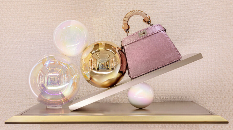 Inspired by an archival Karl Lagerfeld sketch from 1984, Santa Claus becomes a vintage-inspired silhouette shaping a festive tree alongside Peekaboo and Baguette bags, yellow Fendi packaging, and glass ornaments, all placed in balance, apparently unstable on a seesaw. The metallic effect of these elements is reminiscent of the textures of the leather goods of the Fendi Winter Holiday 2024 collection in platinum, silver, sky blue, and dusty pink tones.