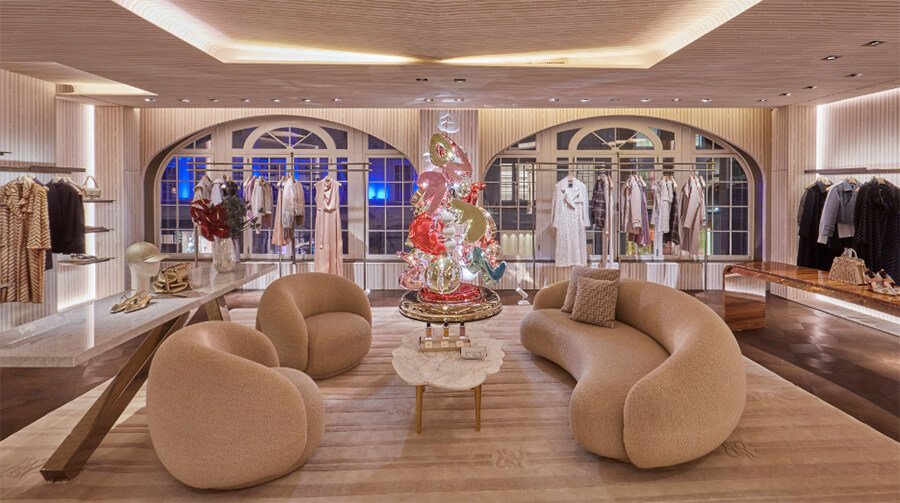 Since the beginning of November, the festive tree has illuminated the iconic boutiques of Palazzo FENDI Seoul, London New Bond Street, Tokyo Ginza 6, and Palazzo FENDI Tokyo Omotesando, in the entrance hall to be visible through the magnificent arched façade of glass.