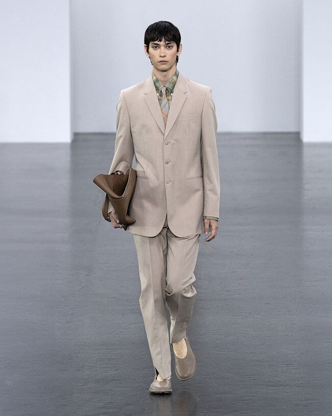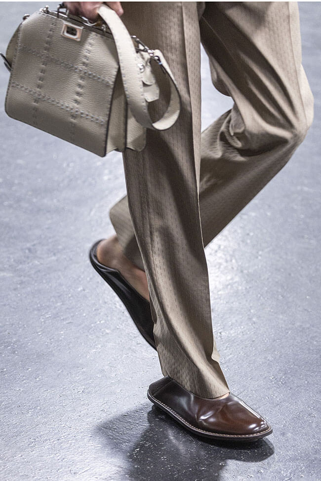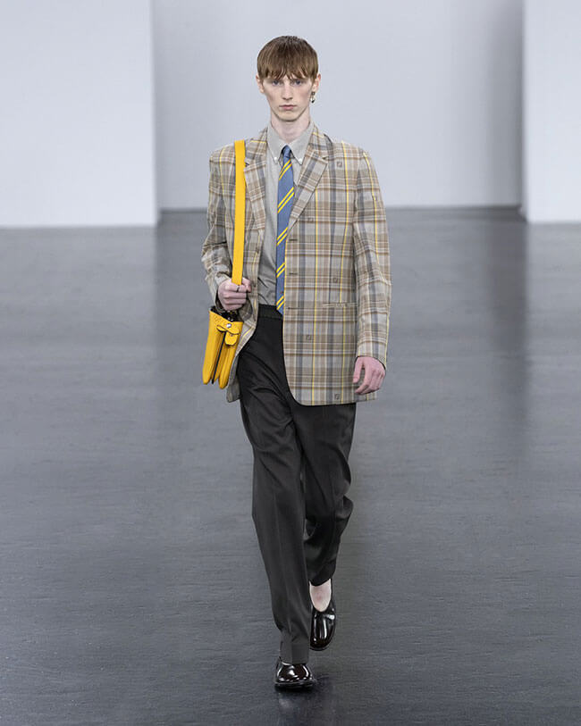 From head to toe, the collection revels in the virtuosity of the Selleria stitch, a technique passed down to the Fendi family by master Roman saddlers in 1925. The collection is reinterpreted as a broken-striped suit jacquard and threads like a stripe or FF logo through linen and plush textures, applied as a surface on Japanese boro denim, or reduced to a minimalist frame on crisp wool outerwear and leather goods. Subtle volumes create whispers of the past, as in a loose-woven bomber jacket, a fluid coat, and 3-button blazers paired with loose, leg-length shorts. Contoured details twist the formality of the garments: poplin shirt sleeves cut at the elbow can be worn long or short, polo plackets twist from throat to ribs, and asymmetrical silk sweaters button at the back shoulder, creating an airy modularity. Over pleated shorts, long layered shirts with patch pockets, and silk bows sport layered under short summer jackets in tonal combinations of linen, leather, Madras check cotton, and ultra-lightweight suede.