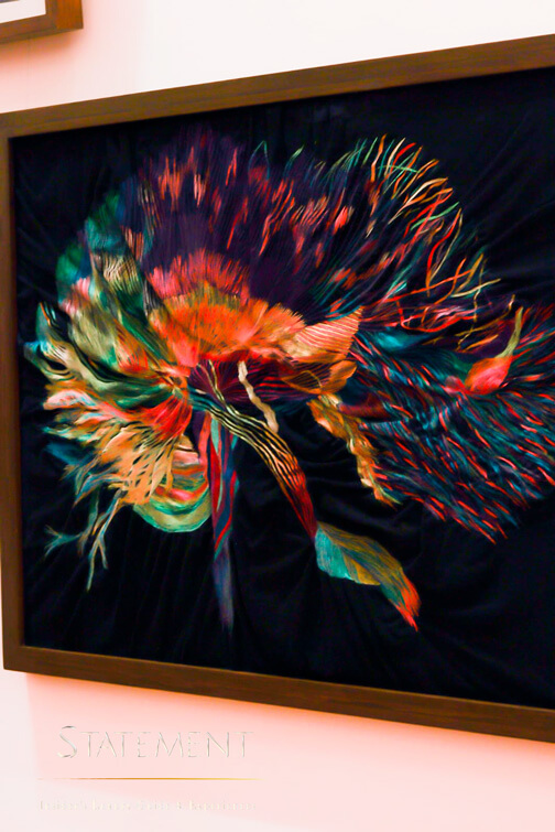 Uno de los pilares de la muestra es la colaboración. Muchas de las obras fueron creadas junto a bordadoras y artesanas de Valle de Bravo, Metepec, la Ciudad de México y Morelia, integrando un tejido colectivo femenino que amplifica la identidad cultural del país.