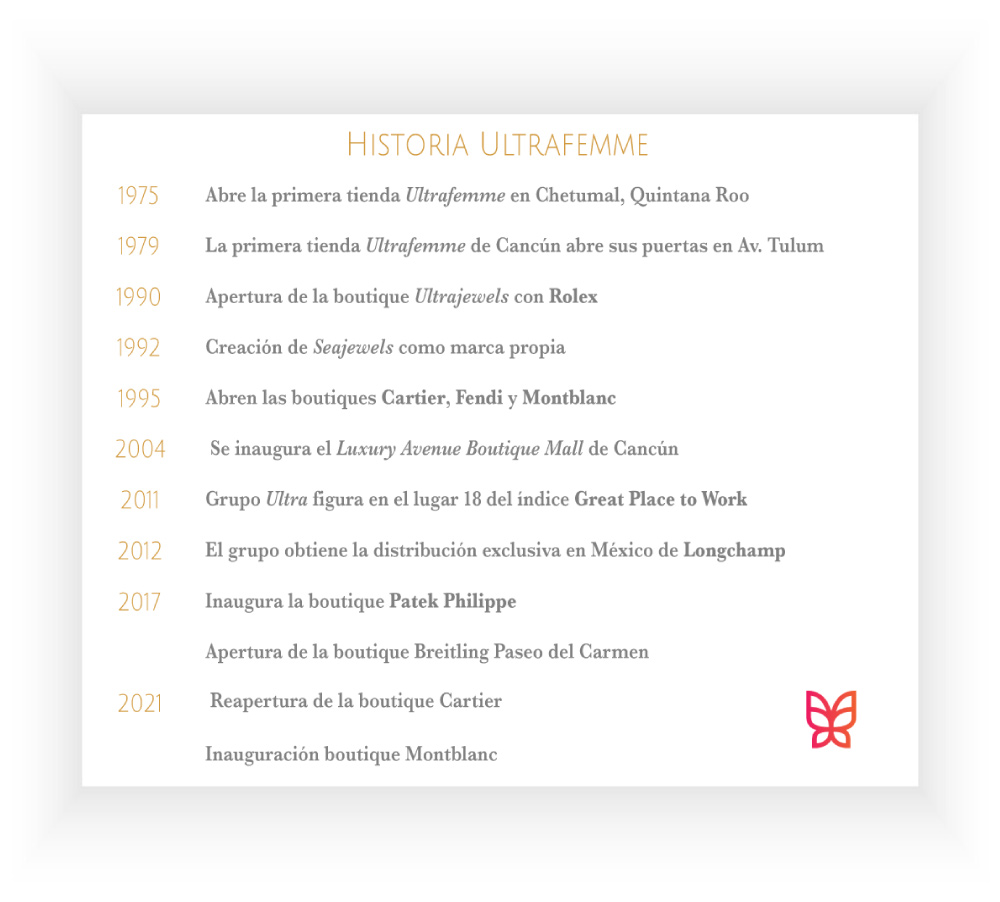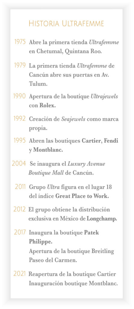 Poco a poco, las casas de lujo, como Cartier, confiaron en la tenacidad de la Sra. Elena Villarreal y su familia quienes, no sólo crearon un negocio, sino que lo convirtieron en una incubadora que apoyó al posicionamiento de grandes marcas internacionales en el sureste de nuestro país. Y lo que vendría después, de manera natural, fue la creación de Grupo Ultra que hoy representa cinco unidades de negocio que representan marcas de lujo en México.